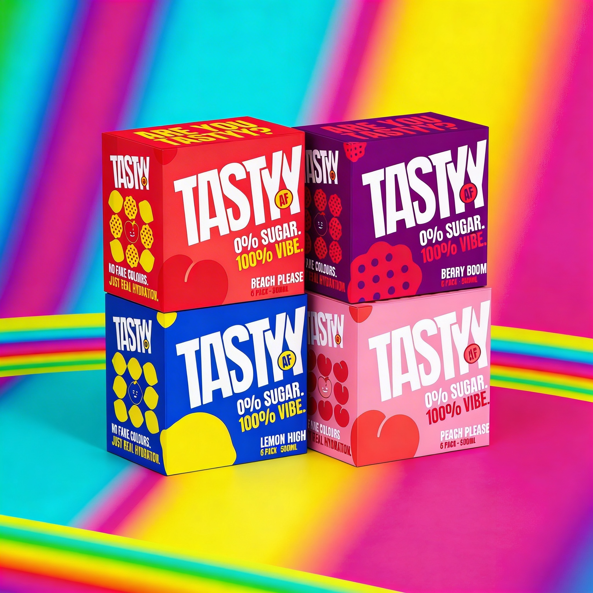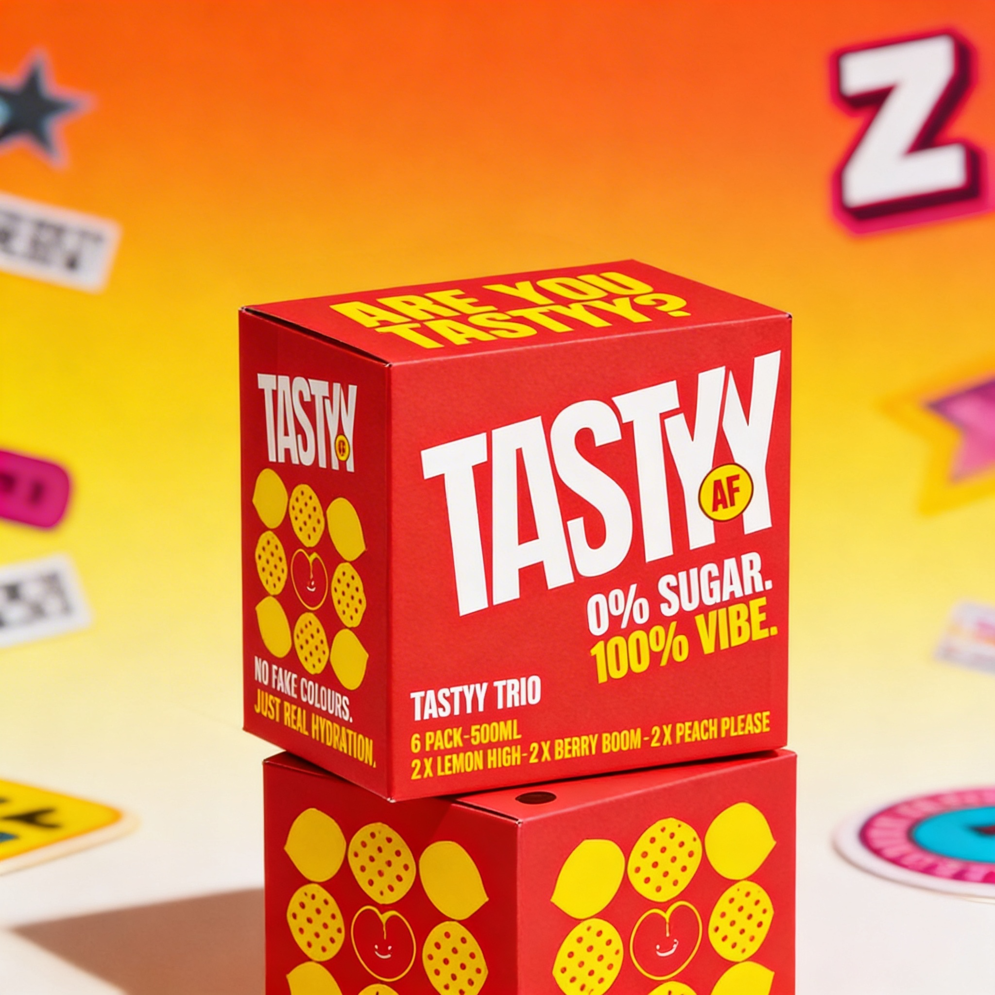 The Tastyy AF Mix Pack brings all three vibes together, Lemon High, Berry Boom, and Peach Please, so your hydration matches your energy.
